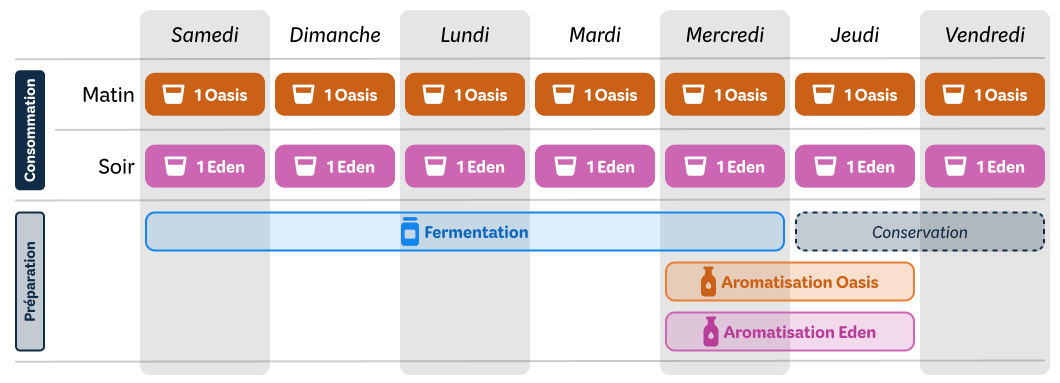 Pour cela : une seule préparation de kombucha le week-end, versée ensuite dans deux bouteilles aux aromatisations distinctes.
