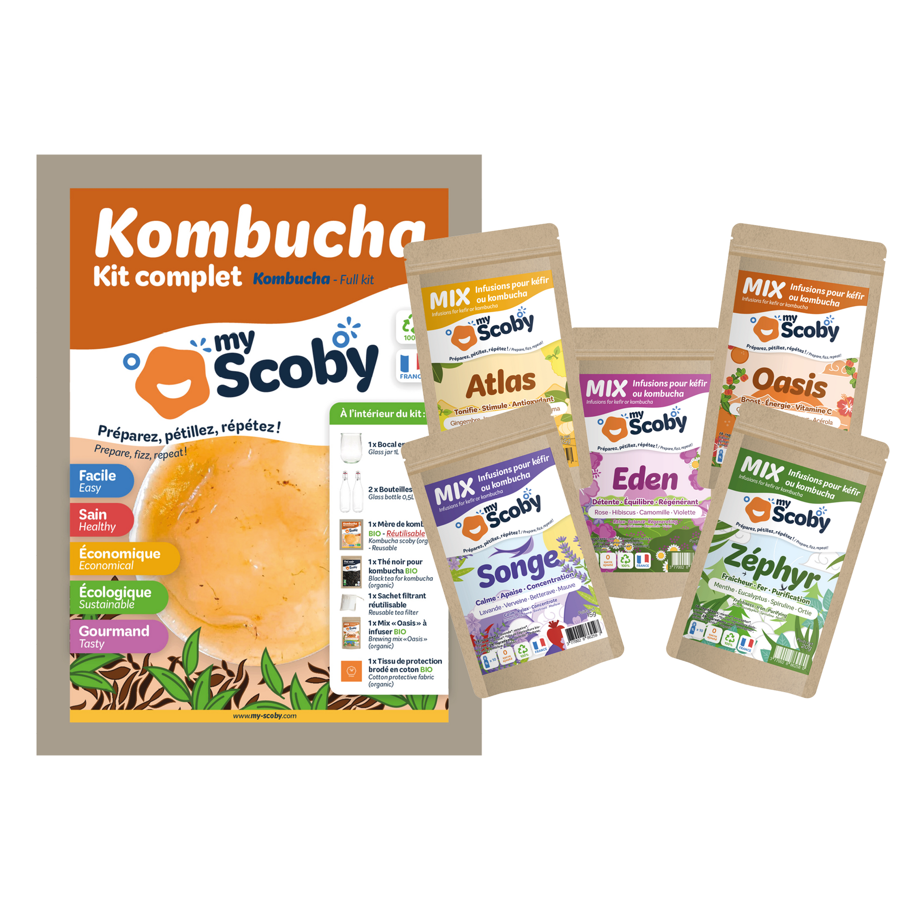 Kit de fermentation prêt à l’emploi + 5 mix aromatiques = une boisson maison saine, délicieuse et pleine de bienfaits. Ne perdez plus de temps à chercher les bons ustensiles et ingrédients : on vous a tout préparé pour démarrer tout de suite, simplement !