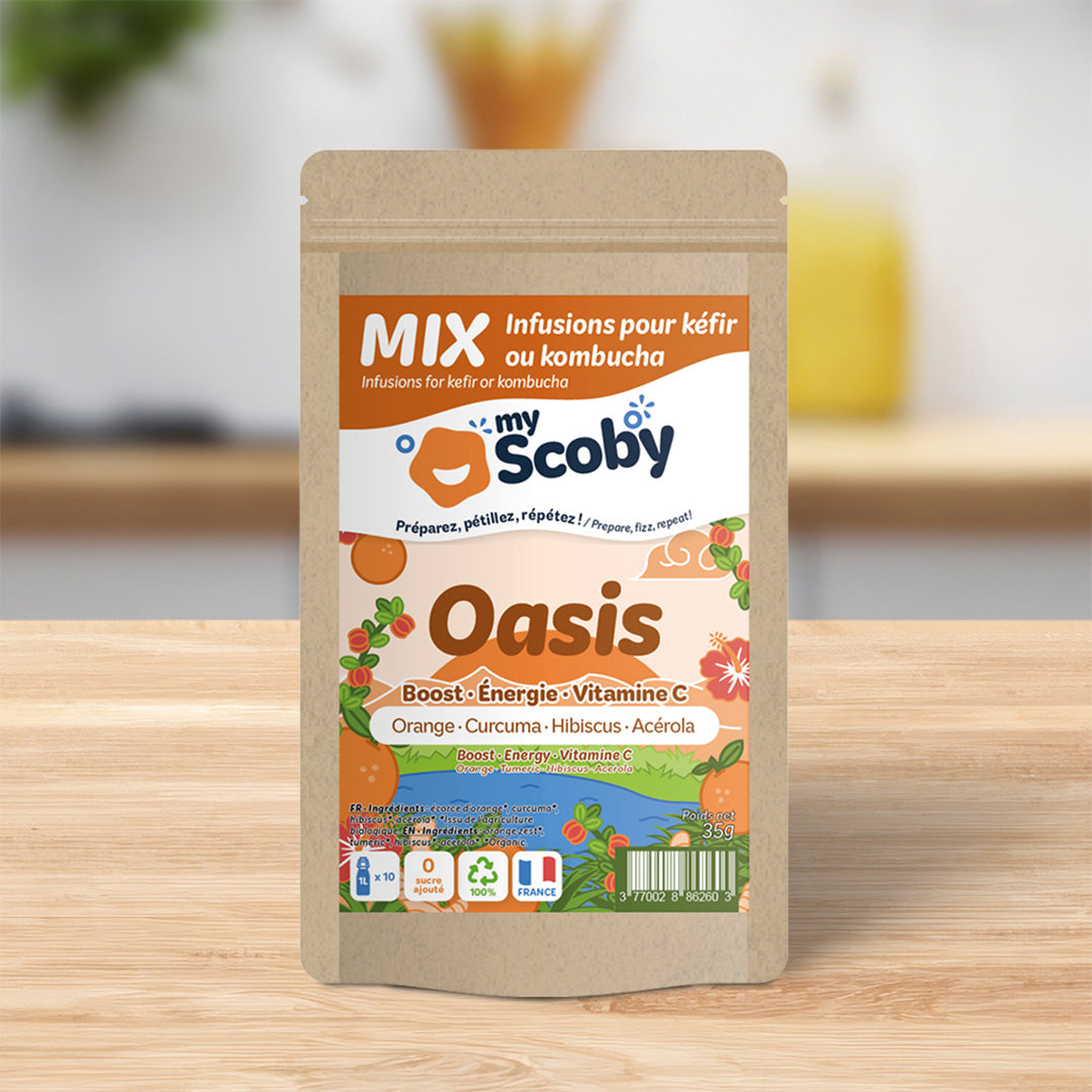 Aromatisez votre boisson de kéfir ou de kombucha avec nos délicieux MIX à infuser 100% naturels : une façon originale d’apporter de nouvelles saveurs et de nouveaux bienfaits à vos propres boissons. Il s'agit d'un assemblage d'ingrédients issus de l'herboristerie, sélectionnés par nos soins pour un résultat fabuleux avec le kéfir de fruit comme le kombucha.